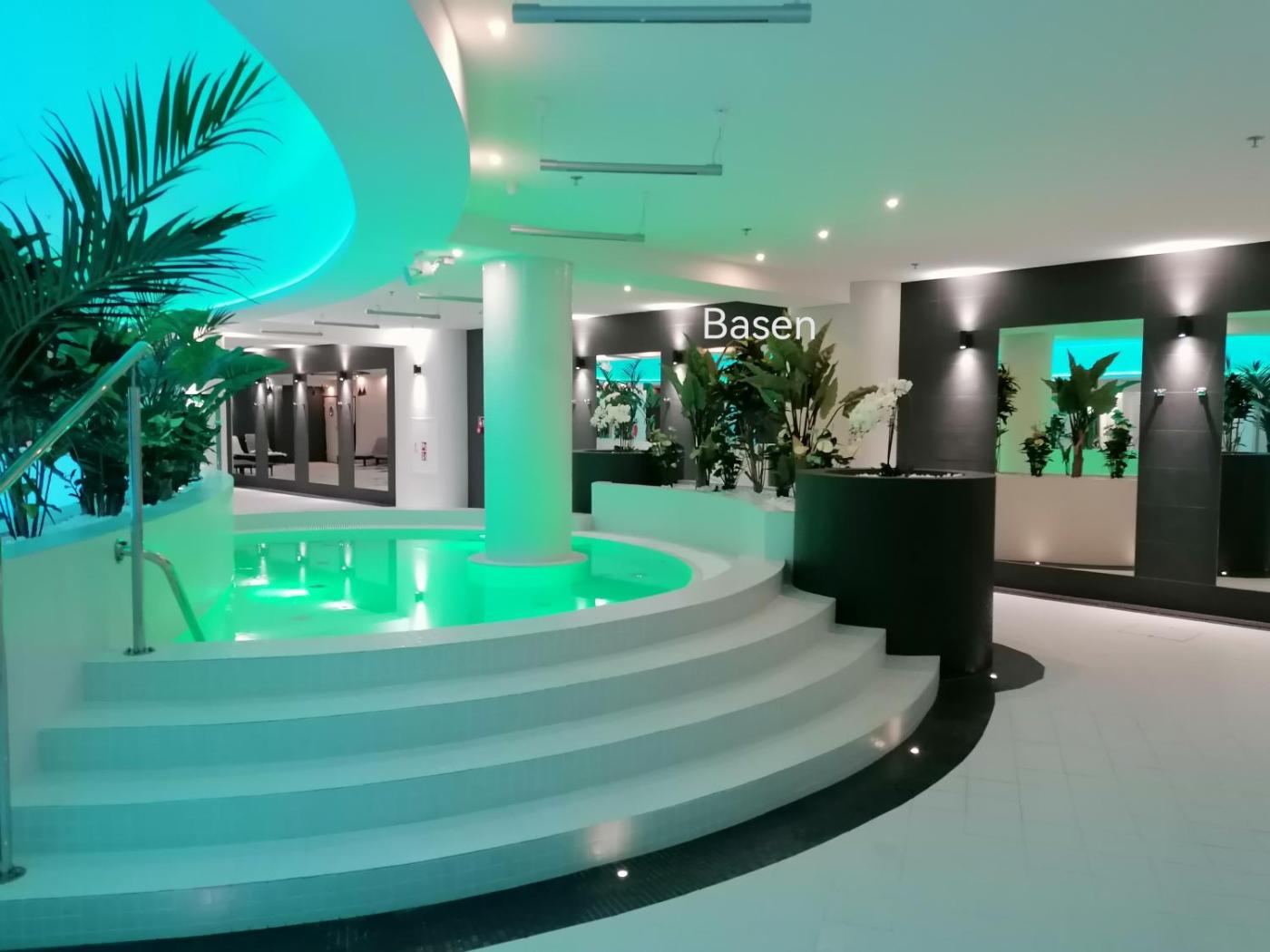 Zaplecze odnowy biologicznej obiektu Szczecin Hanza Tower APARTMENT-BASEN obejmuje kryty basen, saunę i wannę z hydromasażem.